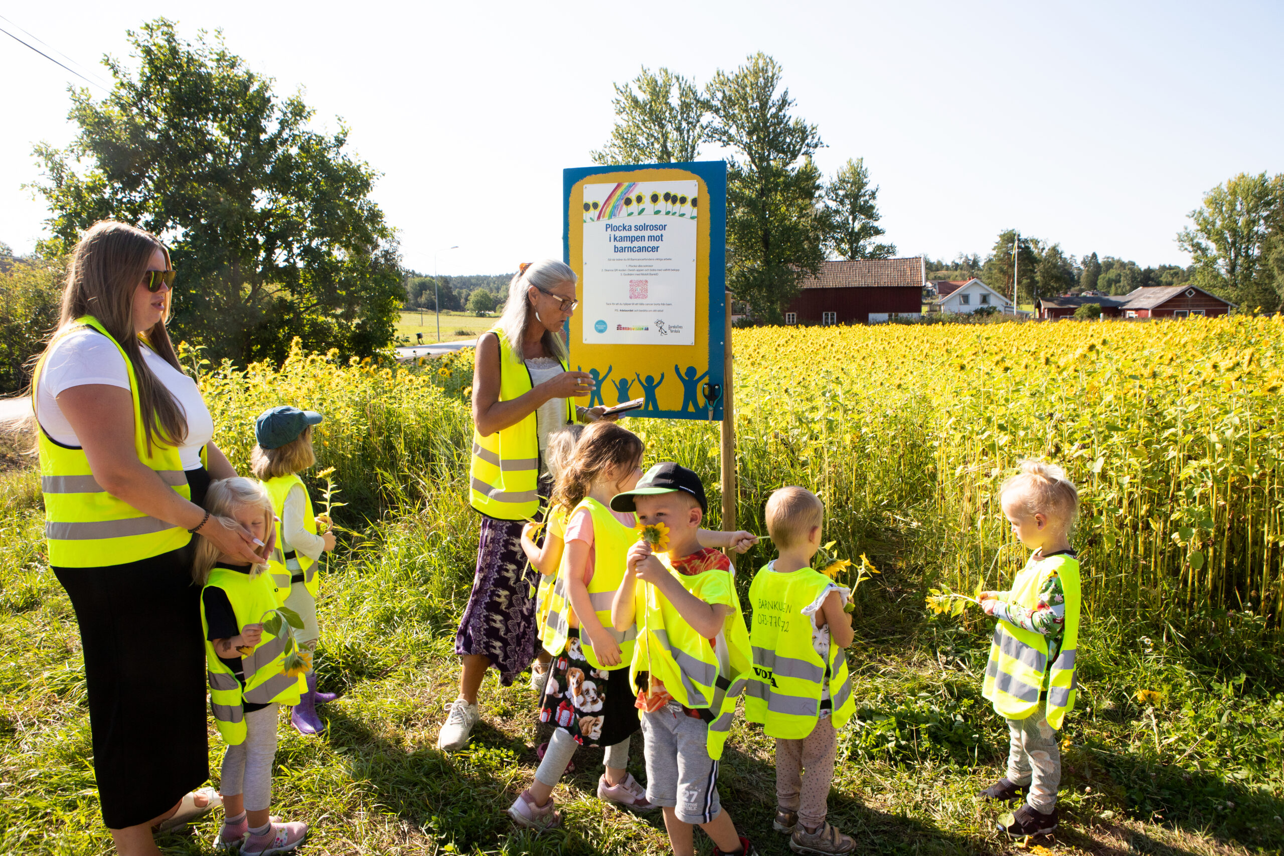 Precis som tidigare år kan allmänheten plocka sin bukett med solrosor och swisha en valfri summa till Barncancerfonden.