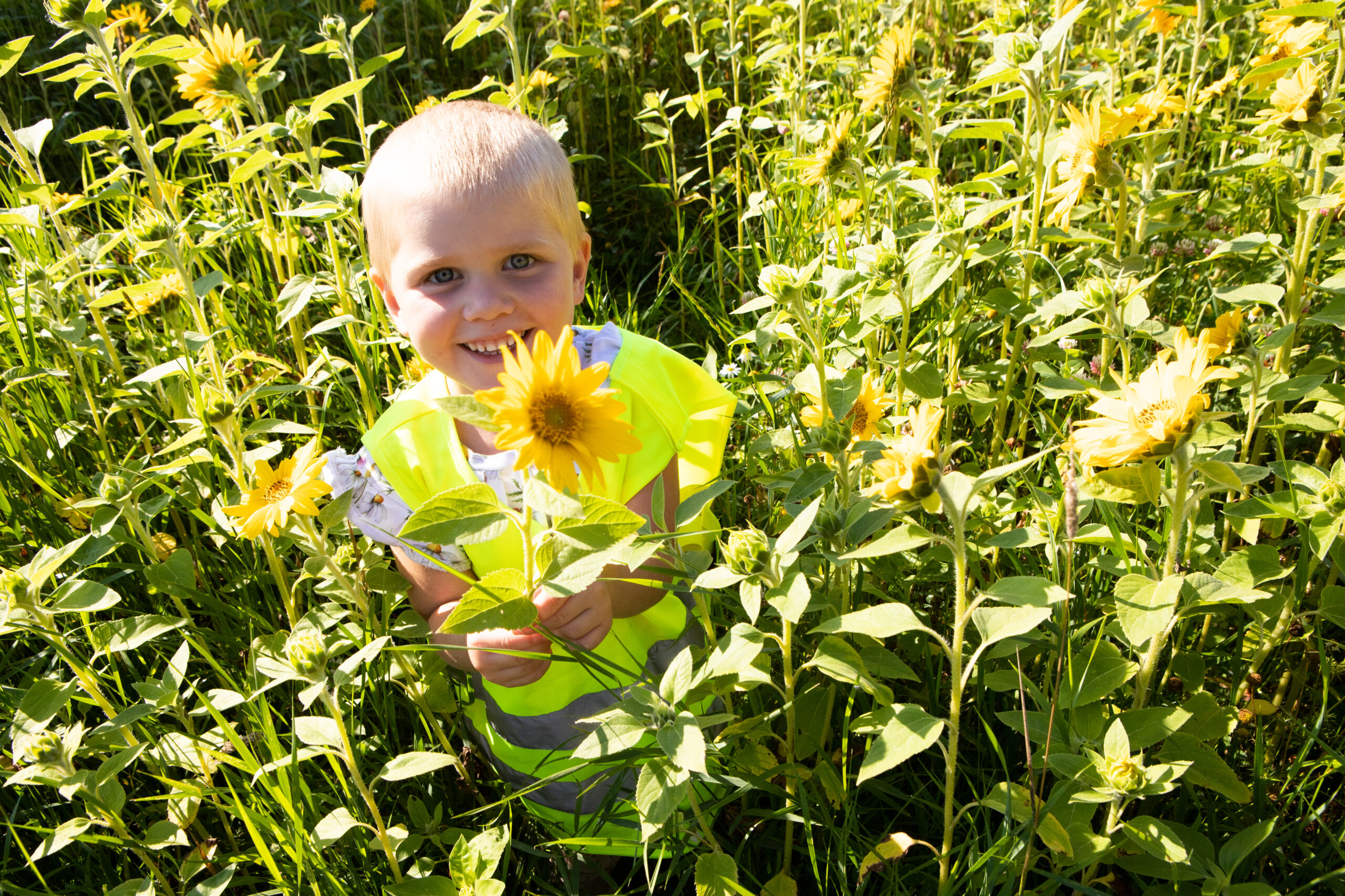 När lokaltidningen besöker fältet av solrosor ska barnen till att plocka en egen bukett som sedan ska sättas i en vas på förskolan.