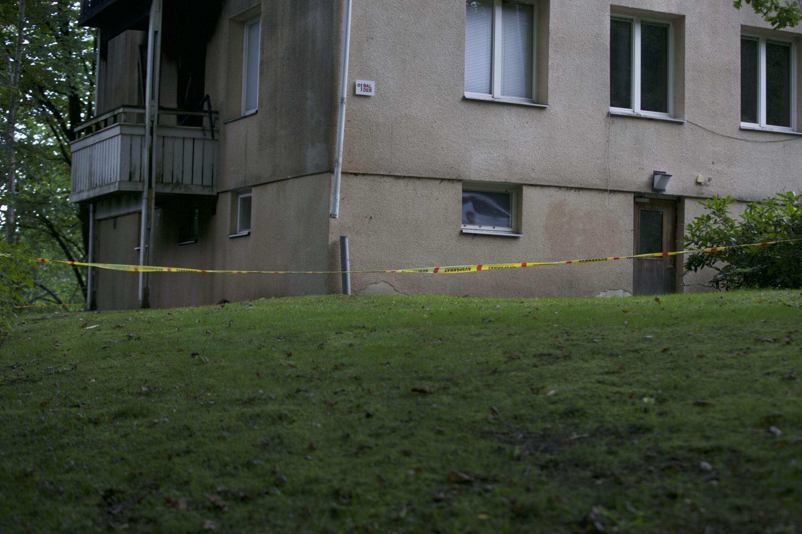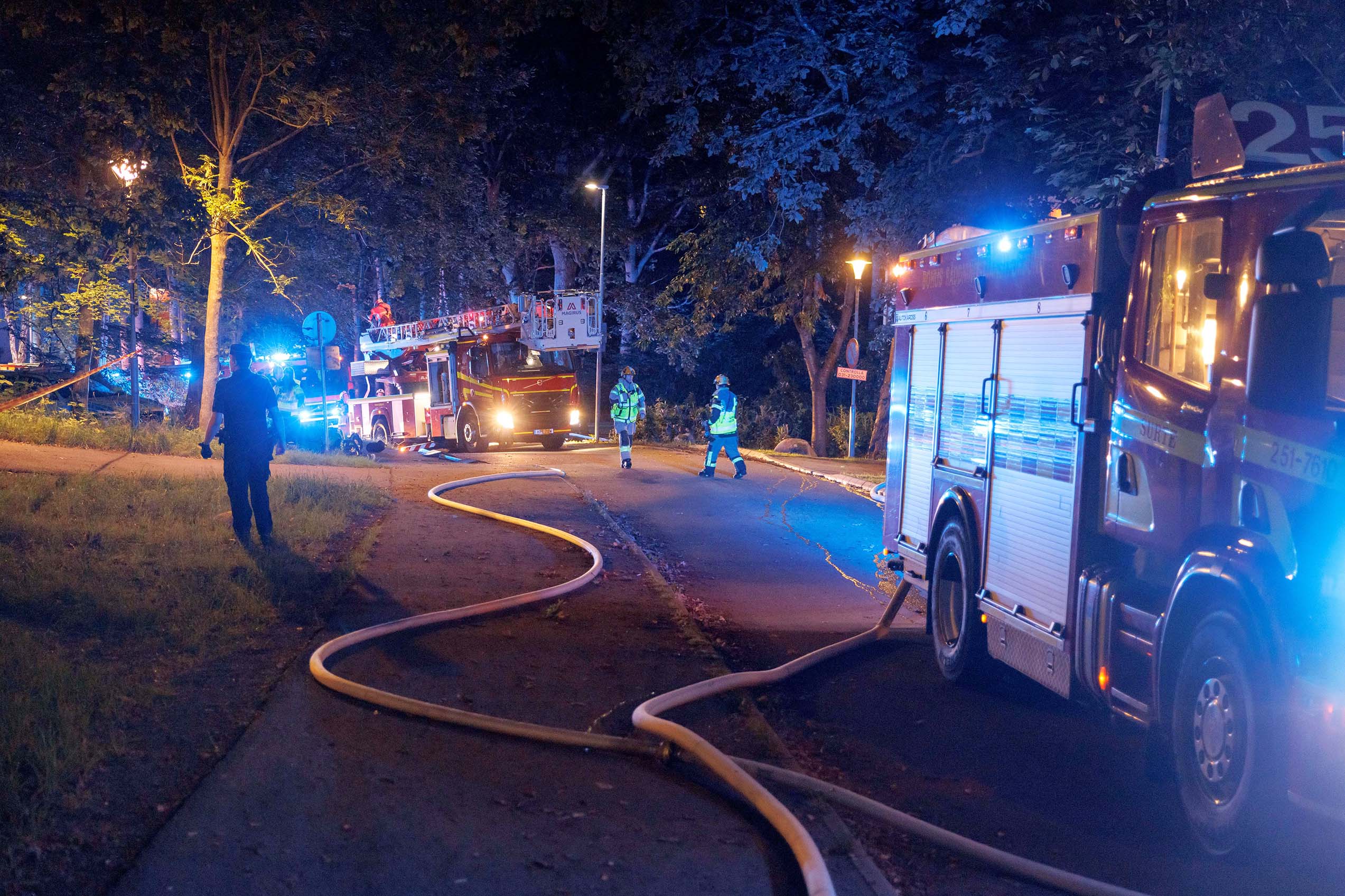 Två timmar efter midnatt utbröt en brand i en lägenhet på Skolstigen. Räddningstjänsten larmades och kom till en fullt utvecklad brand, vilket ställde stora krav på att snabbt evakuera övriga nio lägenheter. En person har förts till sjukhus med okända skador. Räddningstjänsten är fortfarande kvar på platsen med ett antal enheter för att efterbevaka, inte minst är man orolig för att vinden ska ta eld. Polisen har också under natten gripit en person som nu är misstänkt för mordbrand.
