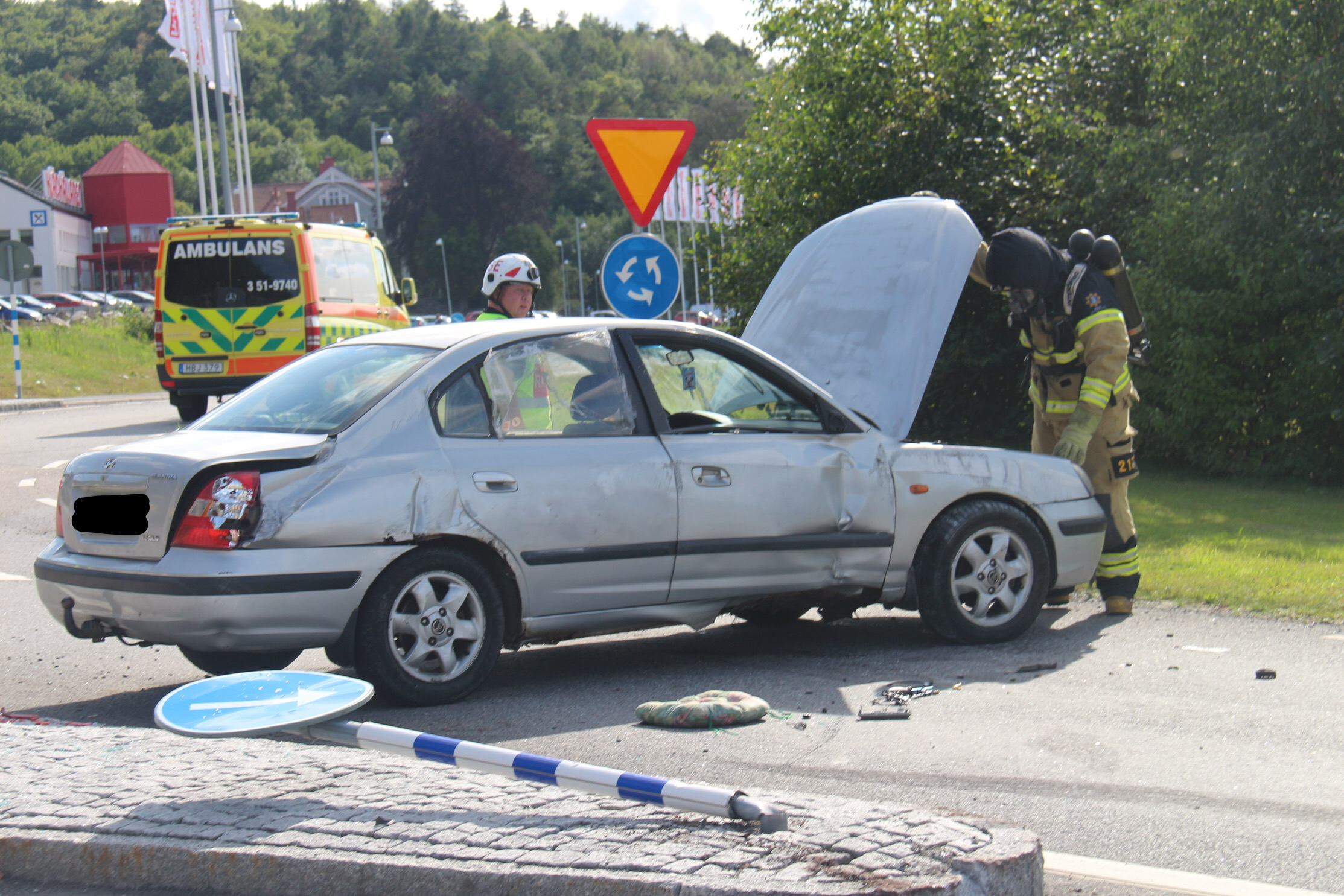 BOHUS. På Vikenvägen, i rondellen vid Klädkällaren, kör en bil in i refug för att sedan lägga sig på sidan. Den manlige föraren lyckades ta sig ur fordonet för egen maskin. Räddningstjänst och ambulans var snabbt på plats. Oklart skadeläge. Händelsen inträffade strax efter klockan 16.